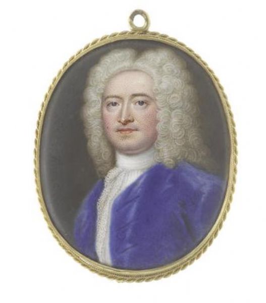 | A Gentleman, wearing blue coat, white chemise, stock and lace cravat, his long powdered wig falling to his shoulders. | |