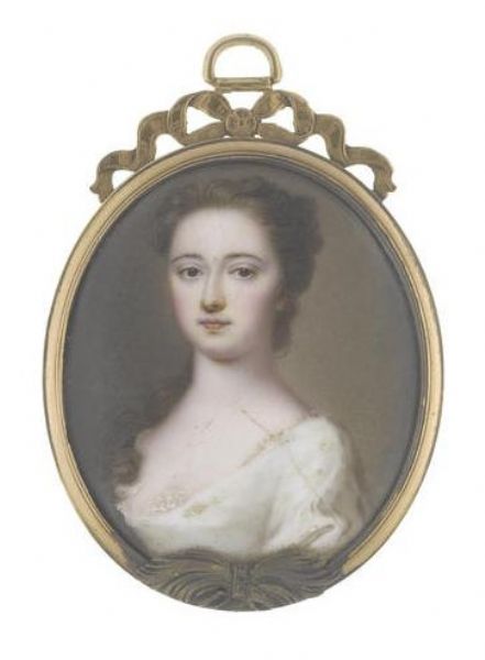 | A Lady, wearing white dress and lace trim, her brown hair partially upswept and falling over her right shoulder. | |