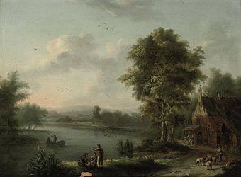 | A river landscape with anglers on a bank and a shepherd with his flock on a track | |