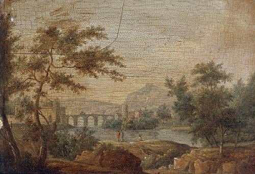 | An extensive river landscape with figures resting on the shore and an aqueduct in the distance | |