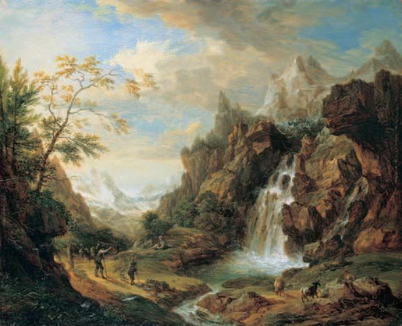 ALPENLANDSCHAFT MIT FIGUREN NEBEN EINEM WASSERFALL