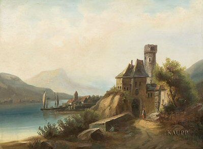 | Mainlandschaft. Idyllische Flusslandschaft mit einer Burg am Ufer. Im Hintergrund Bucht mit Segelbooten und eine Stadt mit Kirch | |