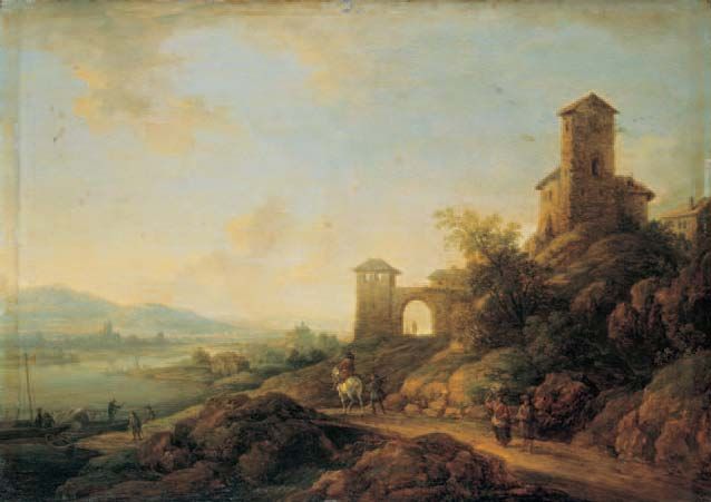 RHEINLANDSCHAFT MIT REITER VOR BURG