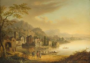 FLUSSLANDSCHAFT MIT UFERBEBAUUNG UND RUINE