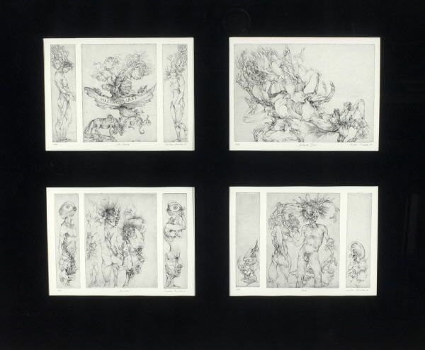 | Vier surrealistische Motive - #Der Drache#, #Fallendes Pferd#, #Menschen# und #Boten# | |