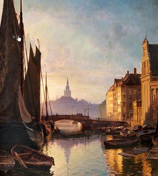 | Kanalen ved Holmens Bro. I Baggrunden Helligaands Kirkens Spir. Solnedgang i Mai. | |