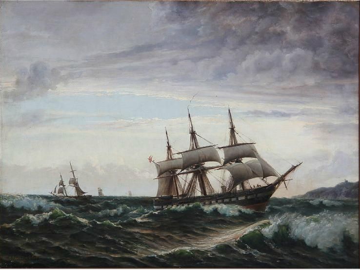 Sailing ships at sea.