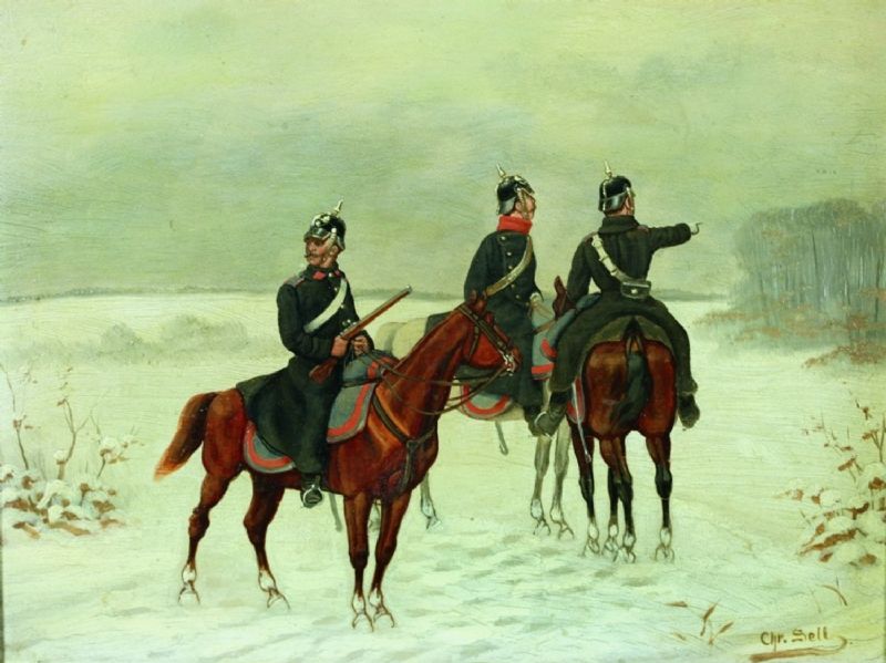 DREI BERITTENE SOLDATEN IN EINER WINTERLANDSCHAFT.