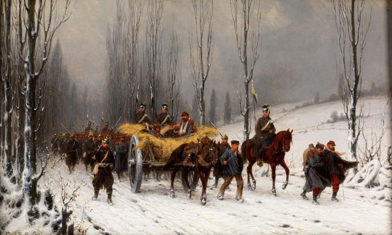 PREUSSISCHE TRUPPEN MIT FRANZÖSISCHEN KRIEGSGEFANGENEN