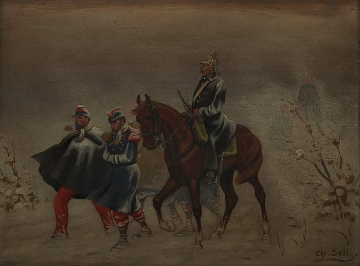 | Deutsche Kavalleristen führen französische Kriegsgefangene ab. Die militärische Darstellung im Schneegestöber | |