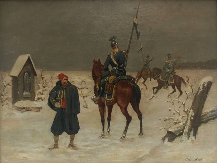 Kavallerie in Winterlandschaft zu Pferd