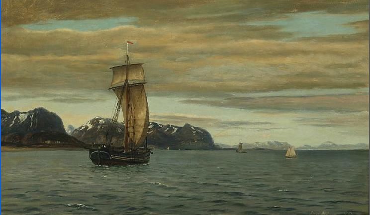 | Seascape with sailing ships off a mountainous coast with snow | |