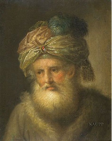 | Brustbildnis eines älteren Herrn mit weißem Bart, prächtigem Turban und pelzgesäumtem Gewand. | |