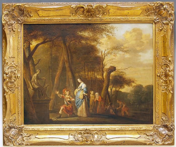 | Landschaftsdarstellung mit einem kniendem Ritter und einer Edeldame sowie ihrem Gefolge vor der Statue Dianas. | |