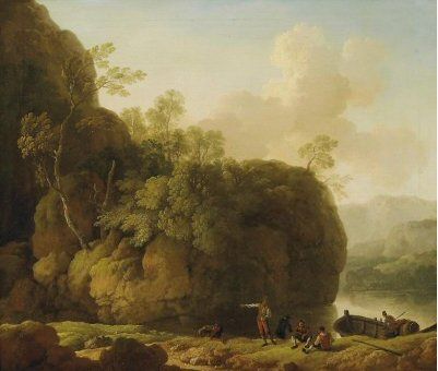 | Romantic rivervalley, a resting oarsman on the banks | |