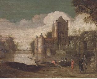 | A landscape with a moated castle and gentlemen conversing by a boat | |