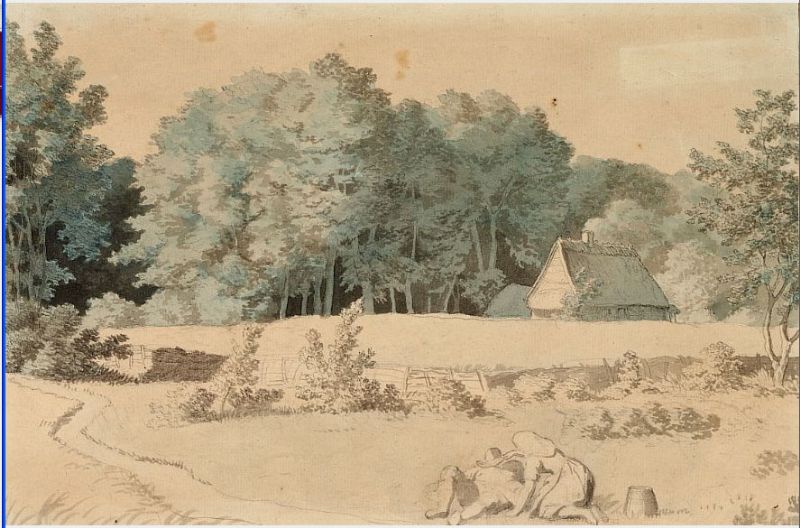 | A thatched farmhouse on the fringes of the forest, in the foreground a young couple, Møn | |
