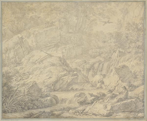 | Rocky wooded landscape with waterfall and Elijah fed by ravens | |