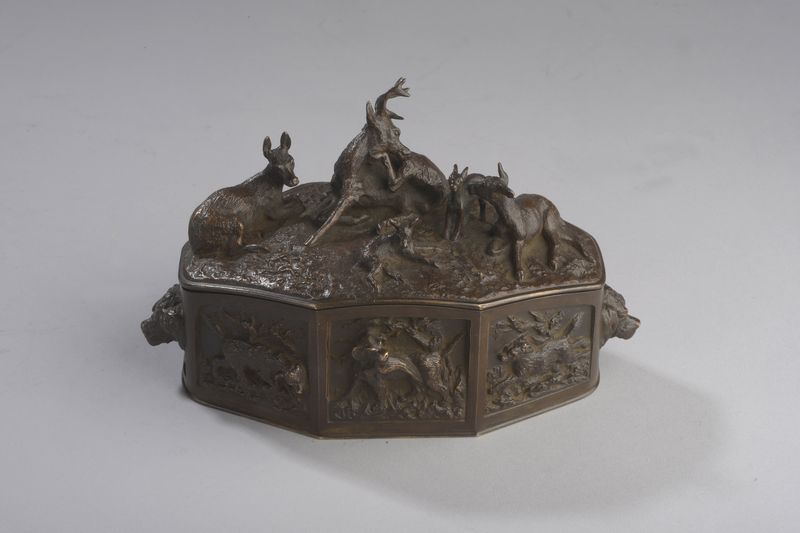 Boite ornée de cerfs, biches, chiens et guirlandes de fleurs