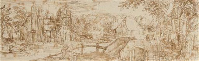 | A village seen across a canal, peasants approaching a bridge over a tributary in the foreground | |