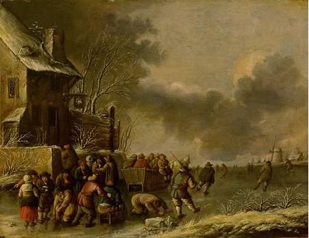 | Winterlandschaft mit zugefrorenem Flusslauf und lebhaftem Treiben vor einem Gasthaus | |