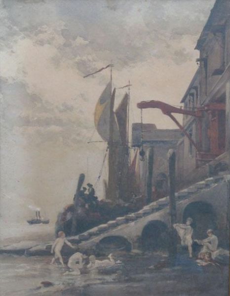 | An Italian quayside with sailing barges, cranes and naked children playing by the water's edge, | |