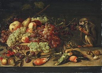 | Apples, cherries, apricots and other fruit in a basket, with pears, plums, robins, a woodpecker, a parrot and a monkey eating nu | |