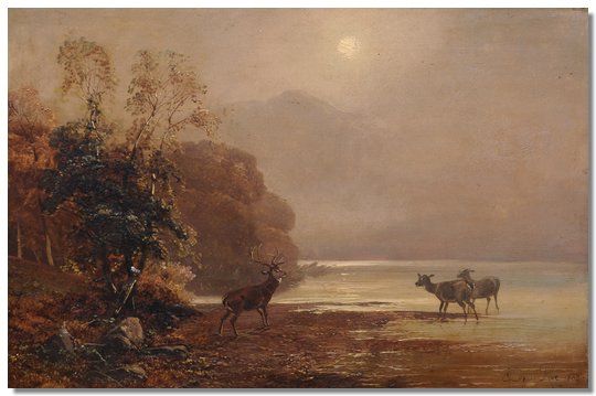 Stags at a lakeside at dusk