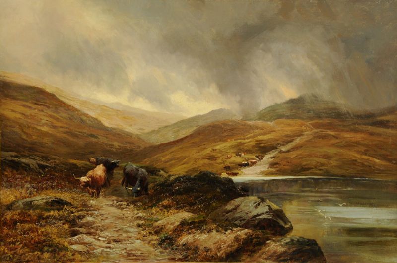 Highland cattle by a loch.