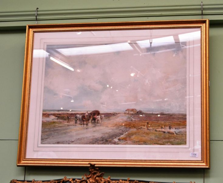 Haycarts and figures in an open landscape