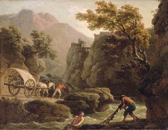 | A mountainous river landscape with fishermen and a peasant leading a horse-drawn cart, a fortress beyond | |