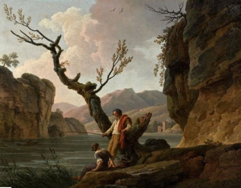 Couple de pêcheurs sur un rocher au bord d'une rivière