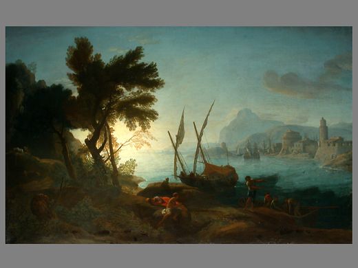 KÜSTENLANDSCHAFT MIT HAFENBURG UND FIGURENSTAFFAGE