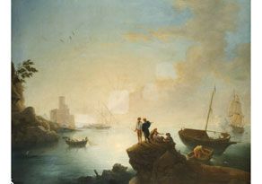 MEERESBUCHT MIT FISCHERN, SEGELSCHIFFEN UND EINER BURG AM KLIPPENUFER