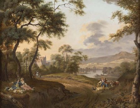 | A WOODED COUNTRY PATH WITH FIGURES PICNICING AND AN AMOROUS COUPLE TENDING SHEEP | |