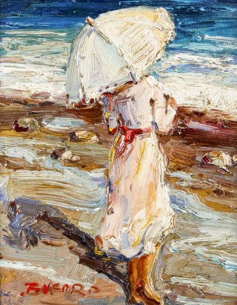 Young Woman on the Beach with Umbrella