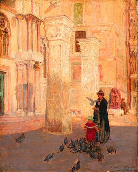 Mère et son enfant nourrisant les pigeons à Venise