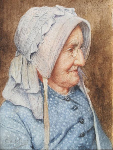 Portrait of an elderly lady wearing a blue dress and paler bonnet