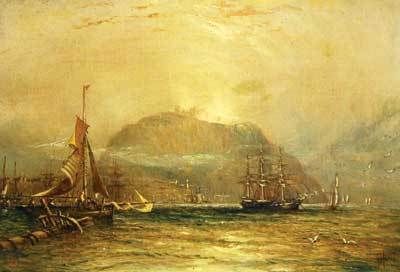 Shipping off a harbour, a clifftop castle emerging through the mist