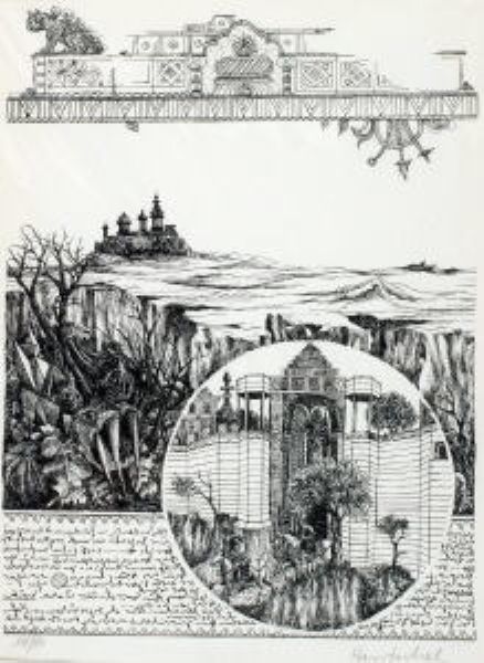 Orientalische Landschaft mit Burg, darunter Schriftzeichen
