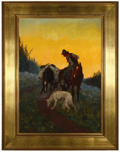 Cowboy on horseback with packhorse and dog
