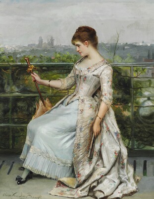 | An elegant young woman sitting on a balcony overlooking Paris | |