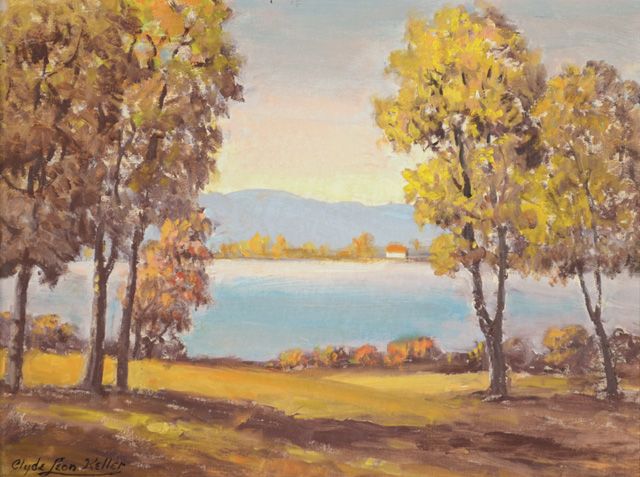 Autumn landscape along the Columbia River, red-roofed barn in the distance