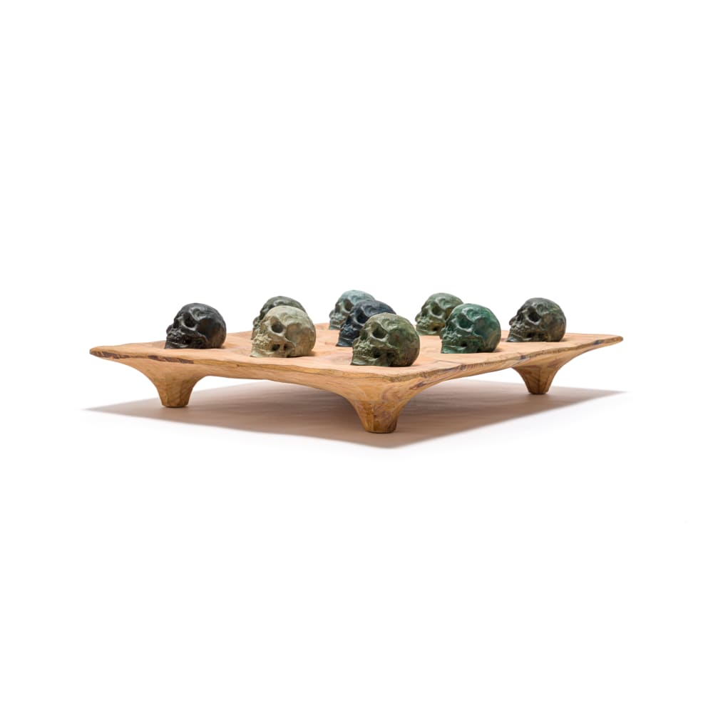 each skull size: height: 8cm; width: 8cm; depth: 11cm; height: 16,5cm including base; width: 63cm; depth 57,5cm; each skull signed with the artist's initials and dated 2018 | |