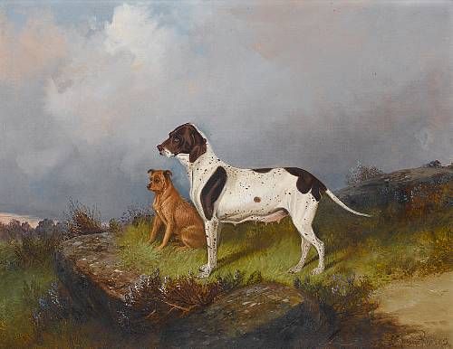 A Pointer and a Terrier waiting on a moor