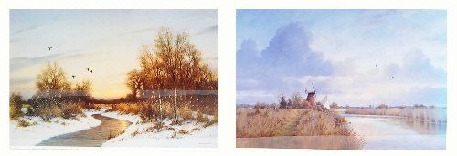 | Ducks in flight over a Norfolk stream in winter, and The Norfolk Broads with ducks and windmill | |