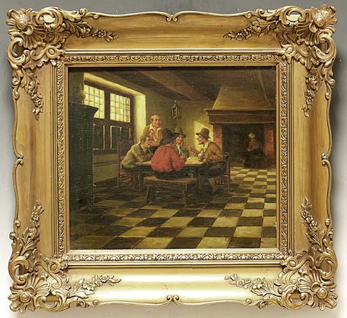 | Interieur mit zechenden Bauern, im Hintergrund Magd am Kamin. | |