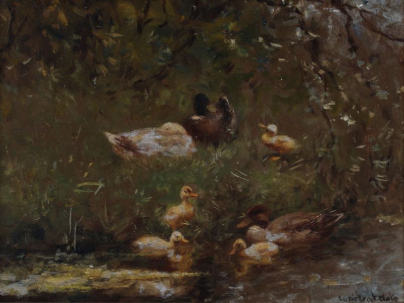 Een eendenfamilie aan de waterkant.