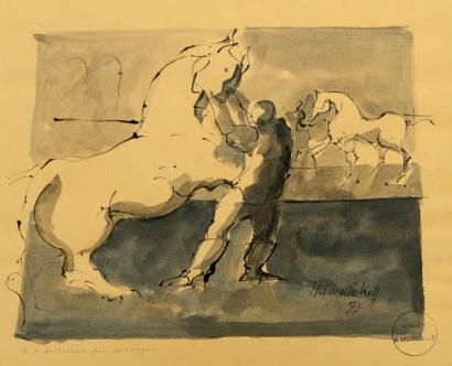 A l'interieur du manège Plume et lavis d'encre