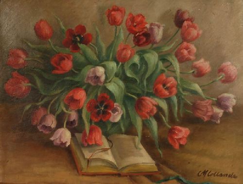Stilleben mit Tulpen und Buch. Wohl 1930's.